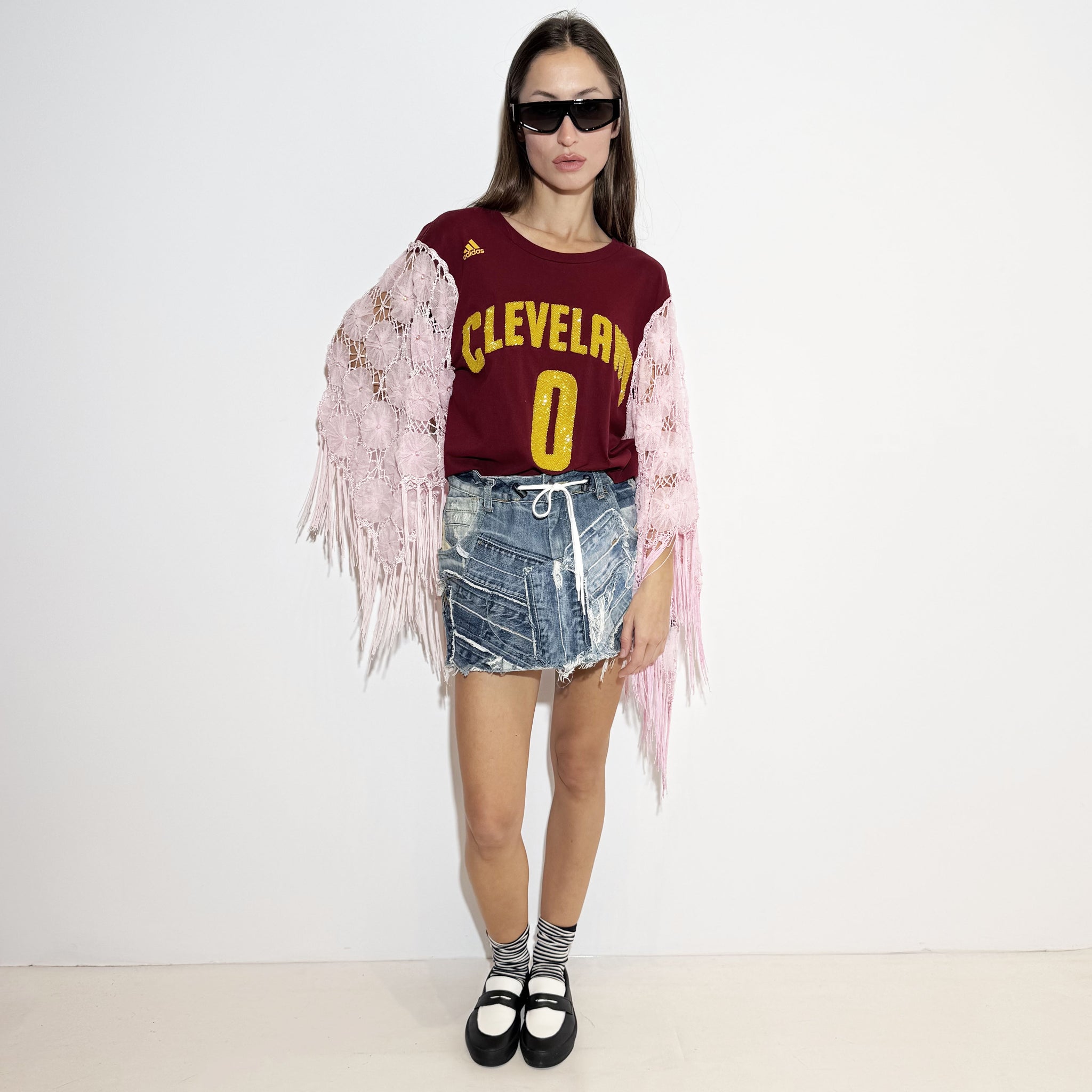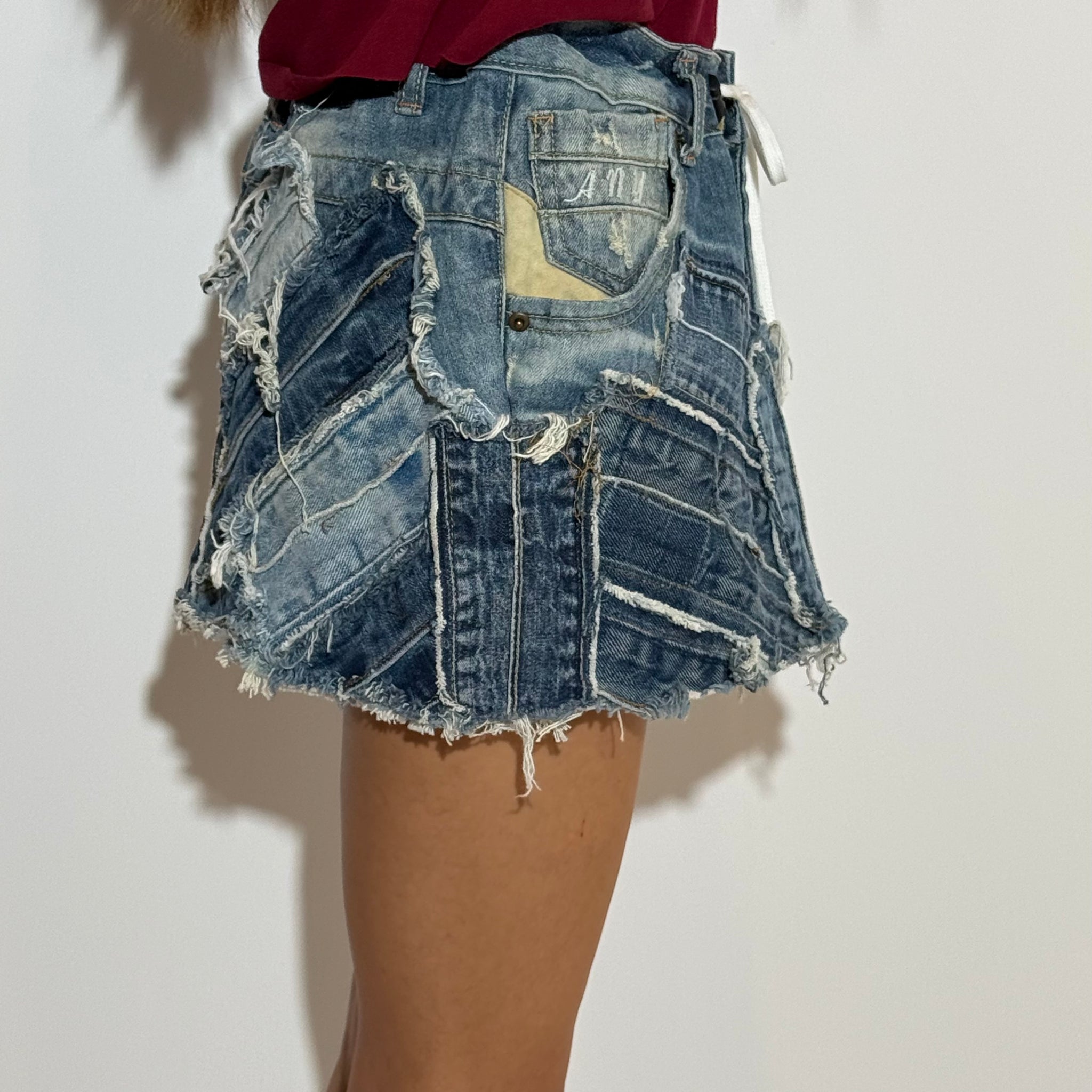 Reworked denim mini skirt. Adjustable with an elastic waistband.