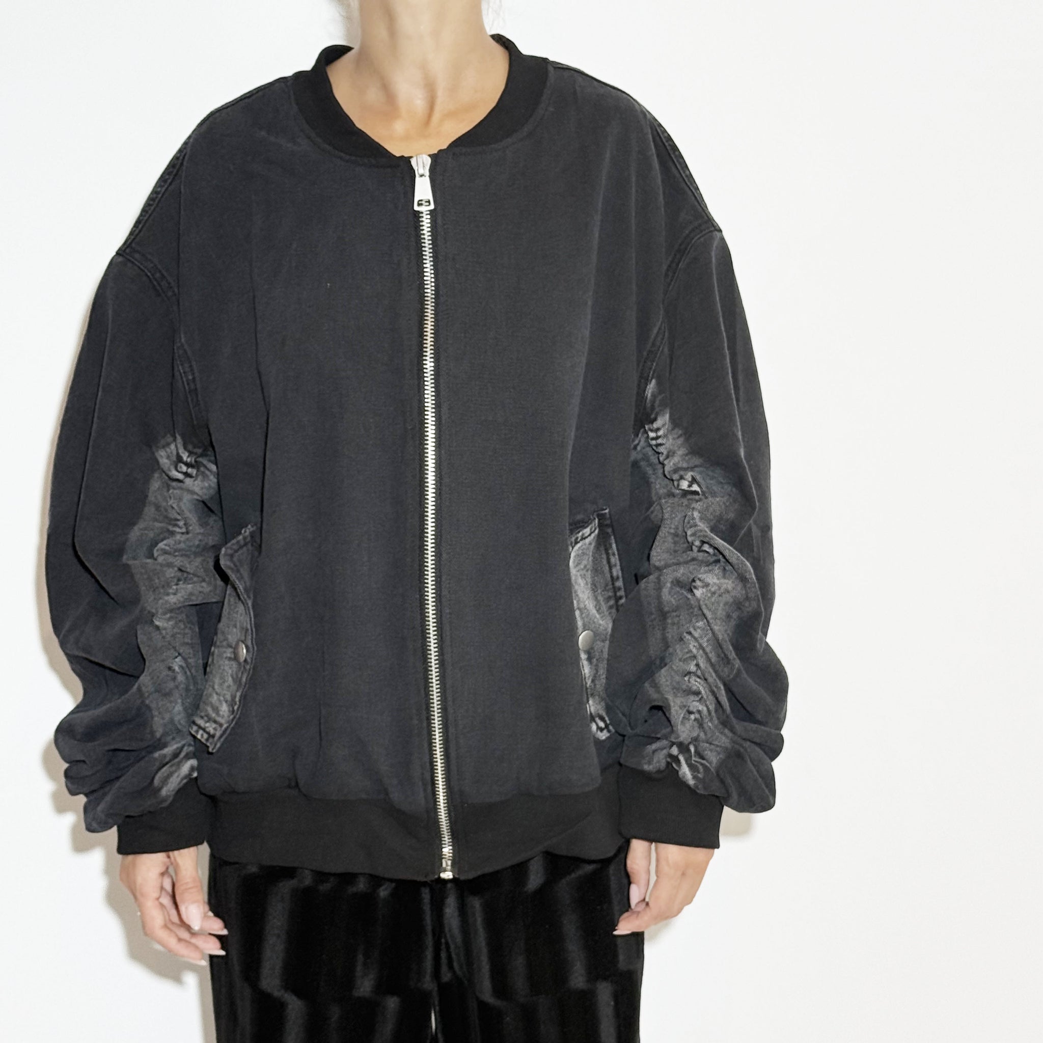 Bomber grey denim jacket, zip-up.