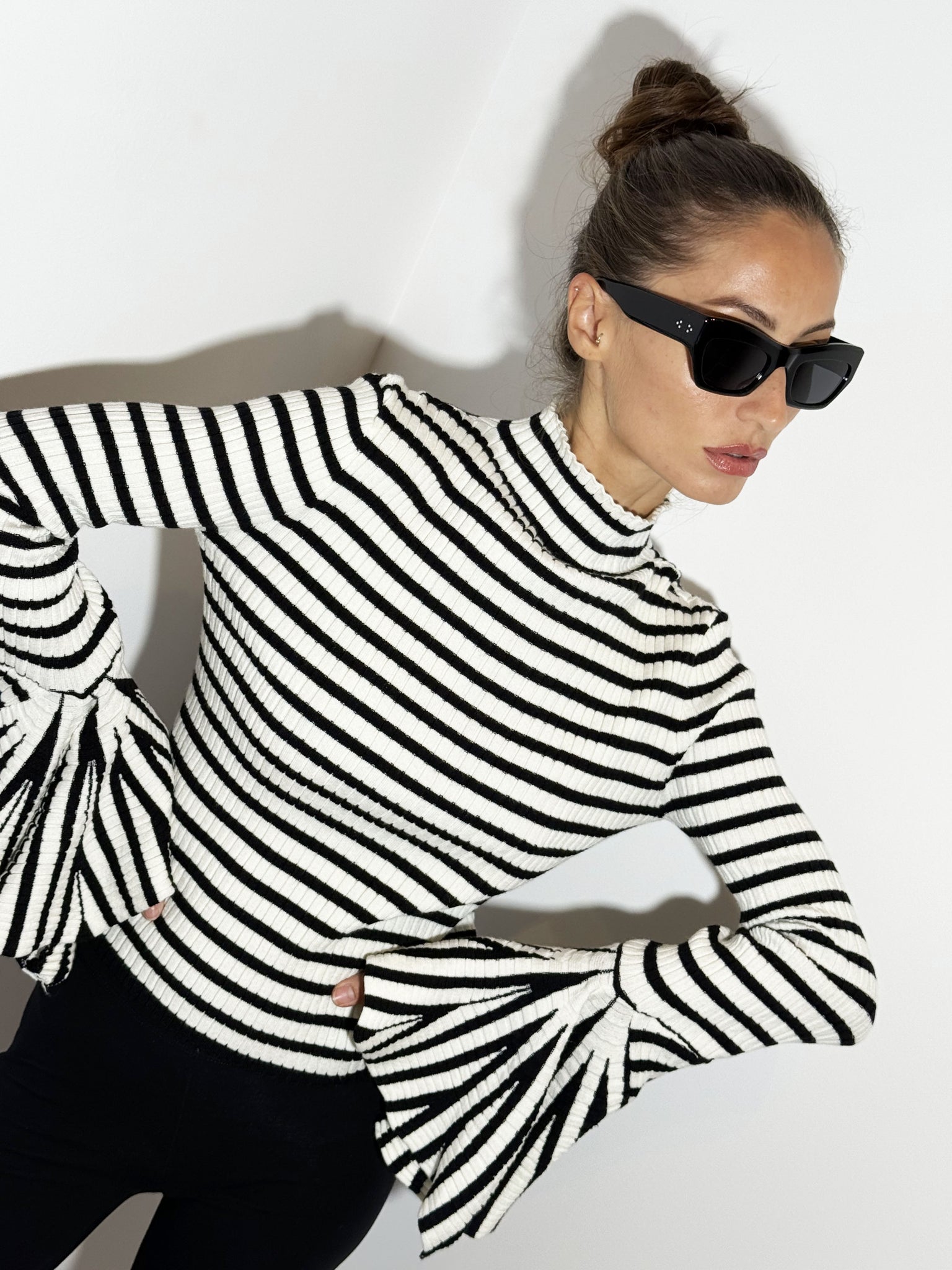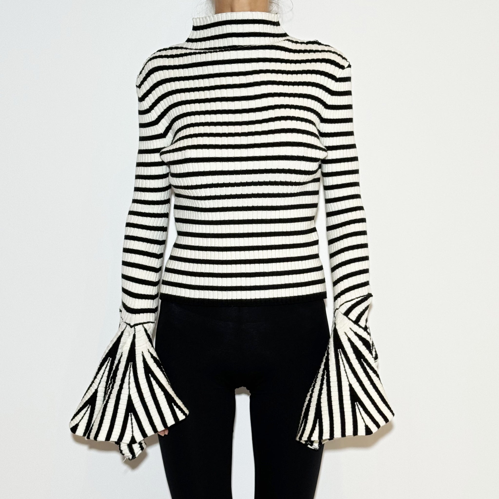 Striped sweater with flared sleeves at the ends. Close-fitting.
