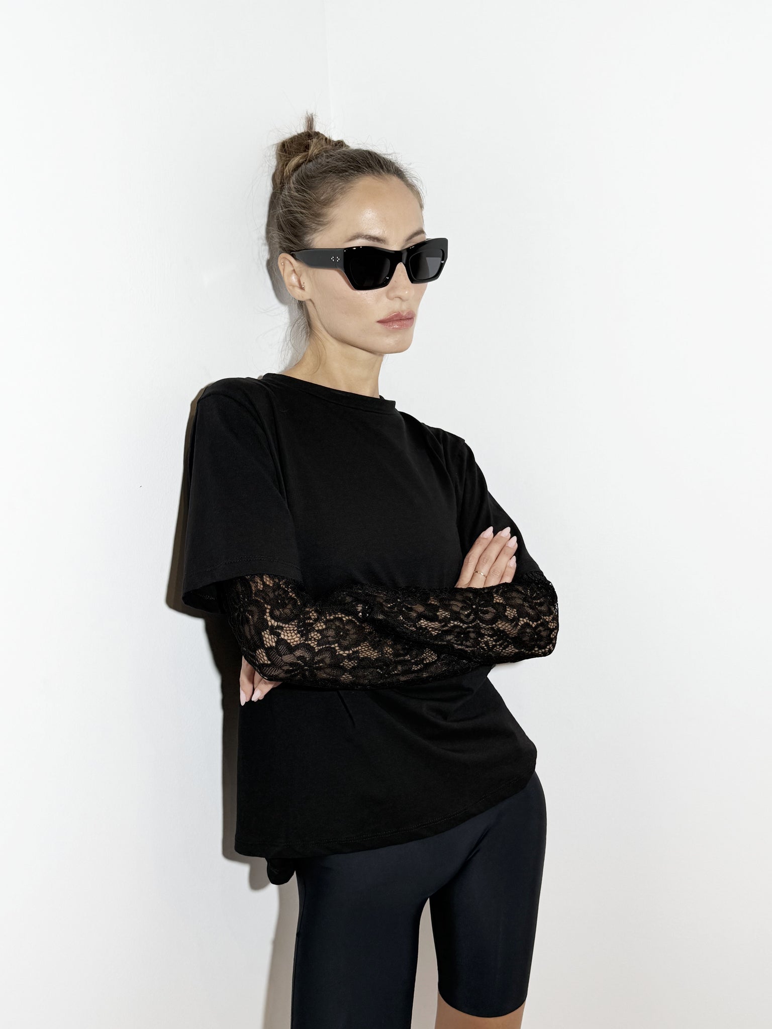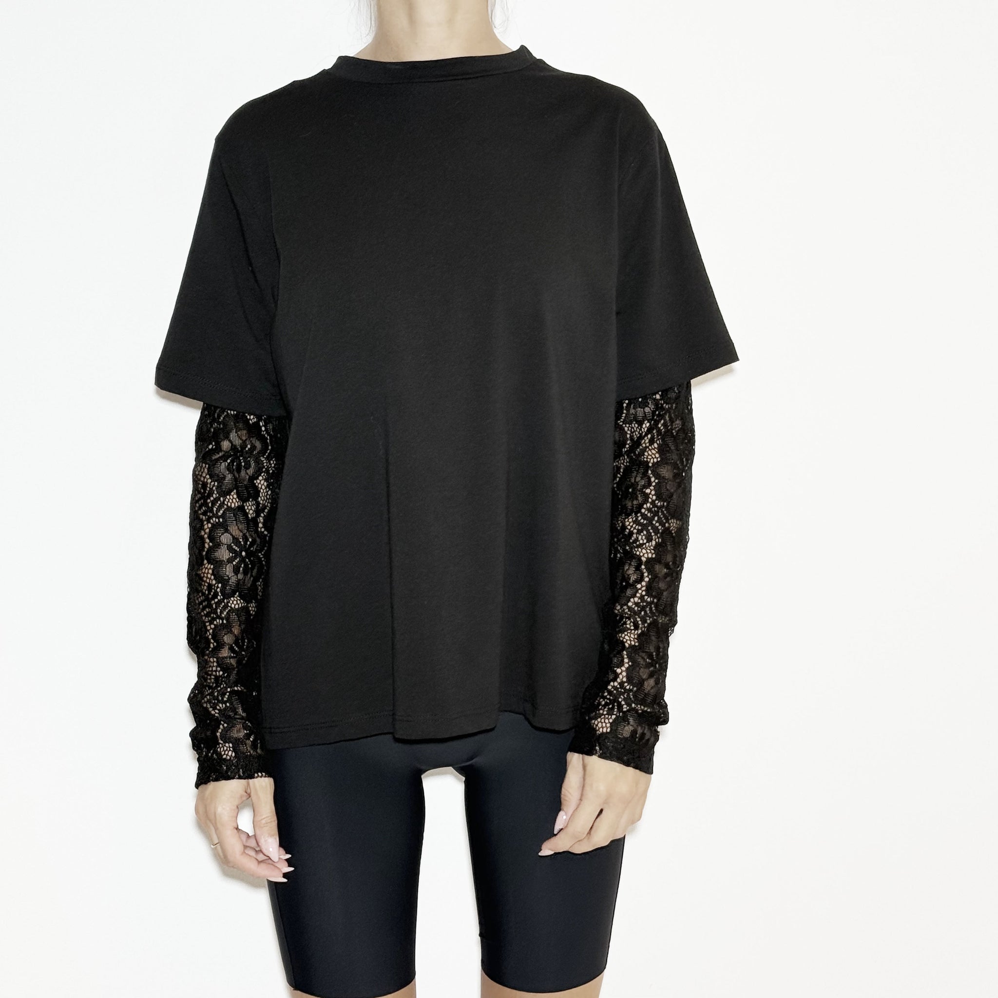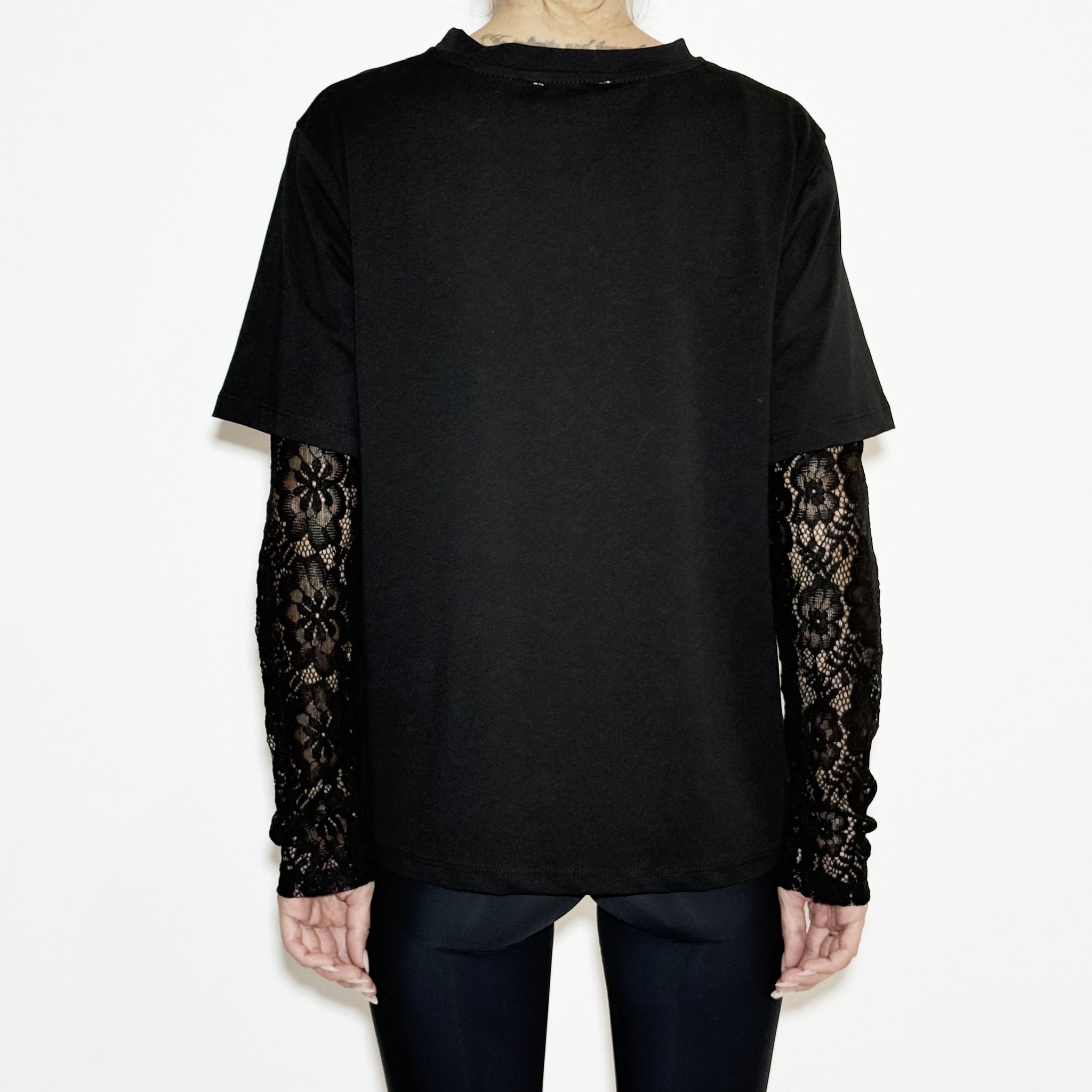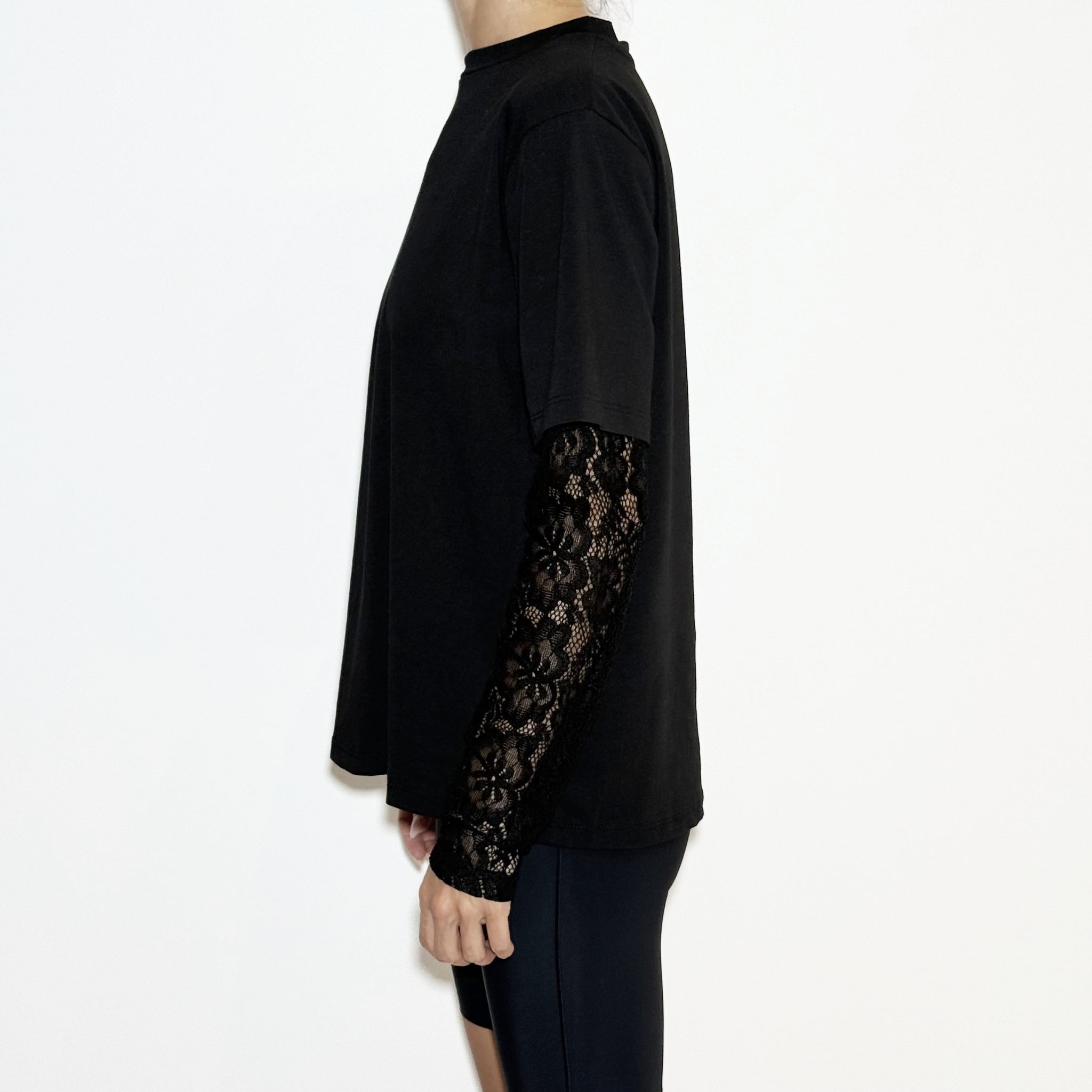 Black t-shirt with lace long sleeves.