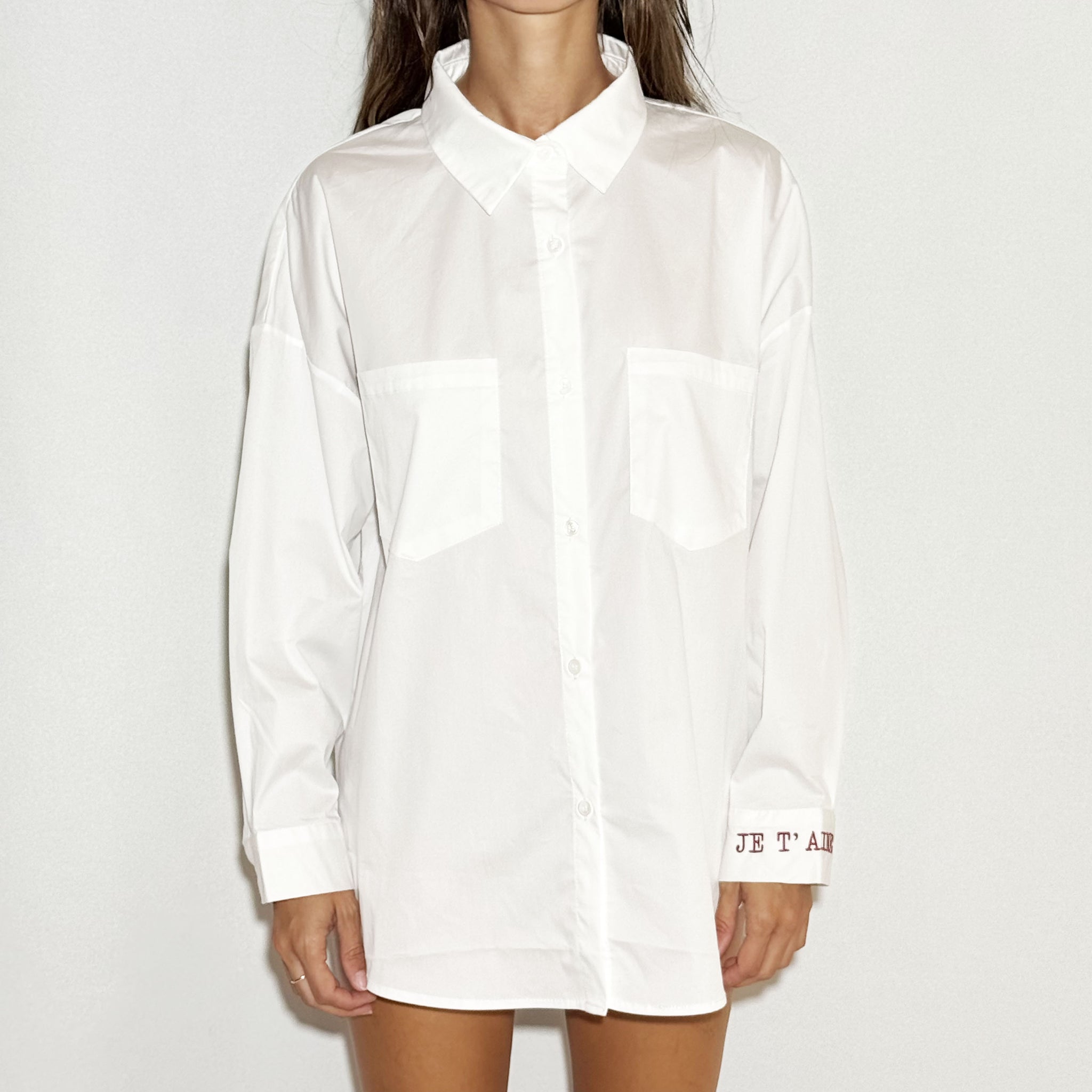 White long sleeves shirt with "JE T'AIME" inscription on the cuff on the left sleeve.