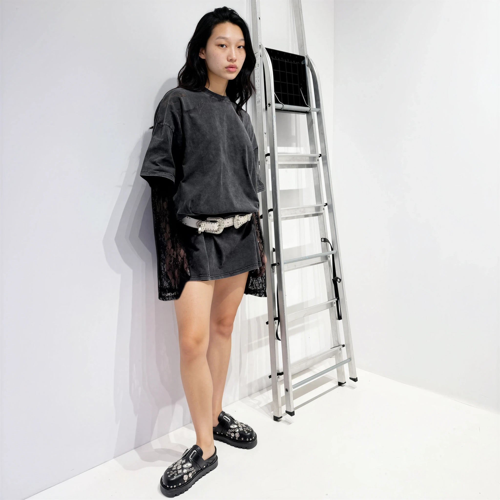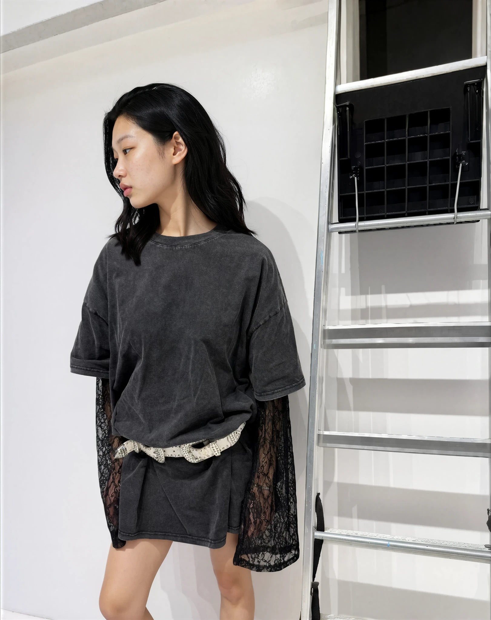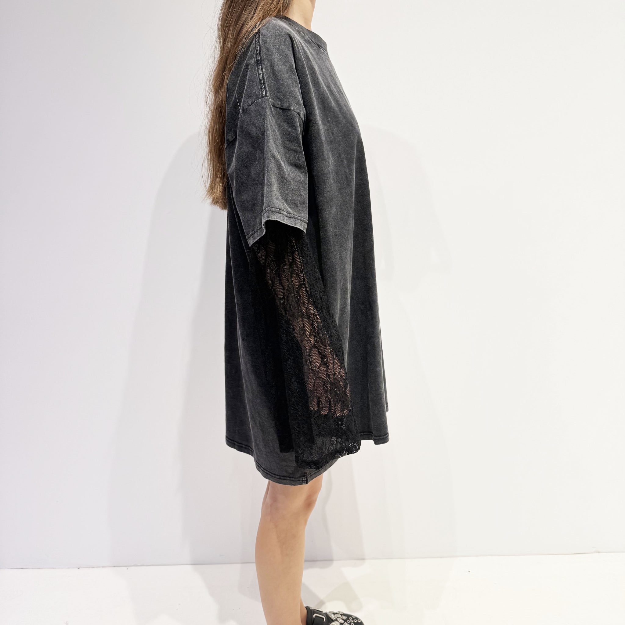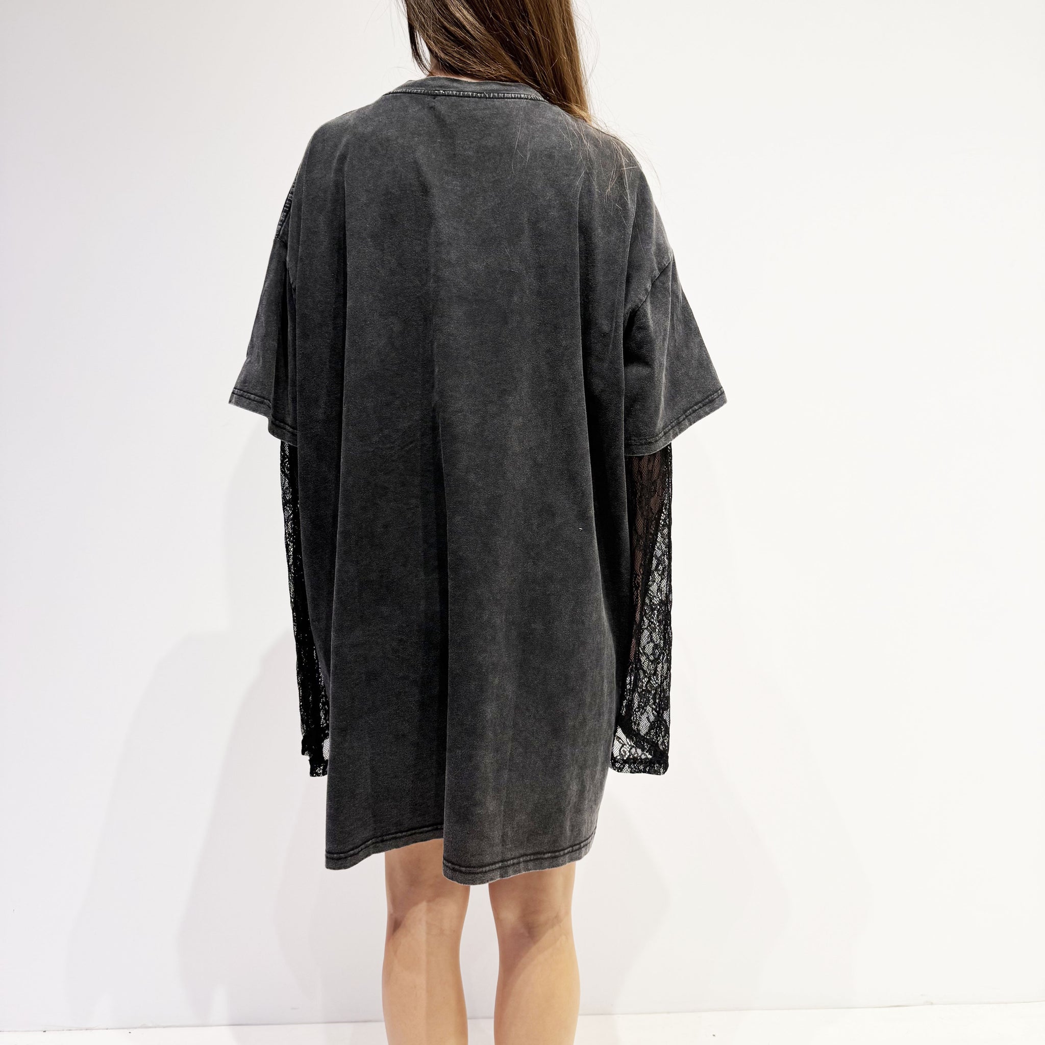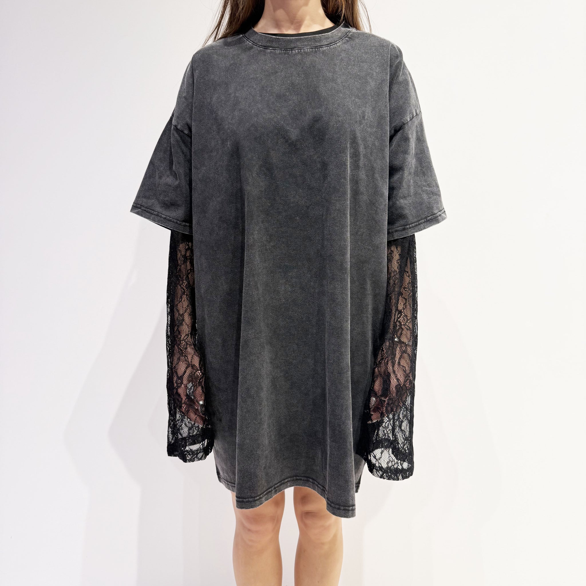 Oversize lace long-sleeve dress with a short-sleeve T-shirt dress over