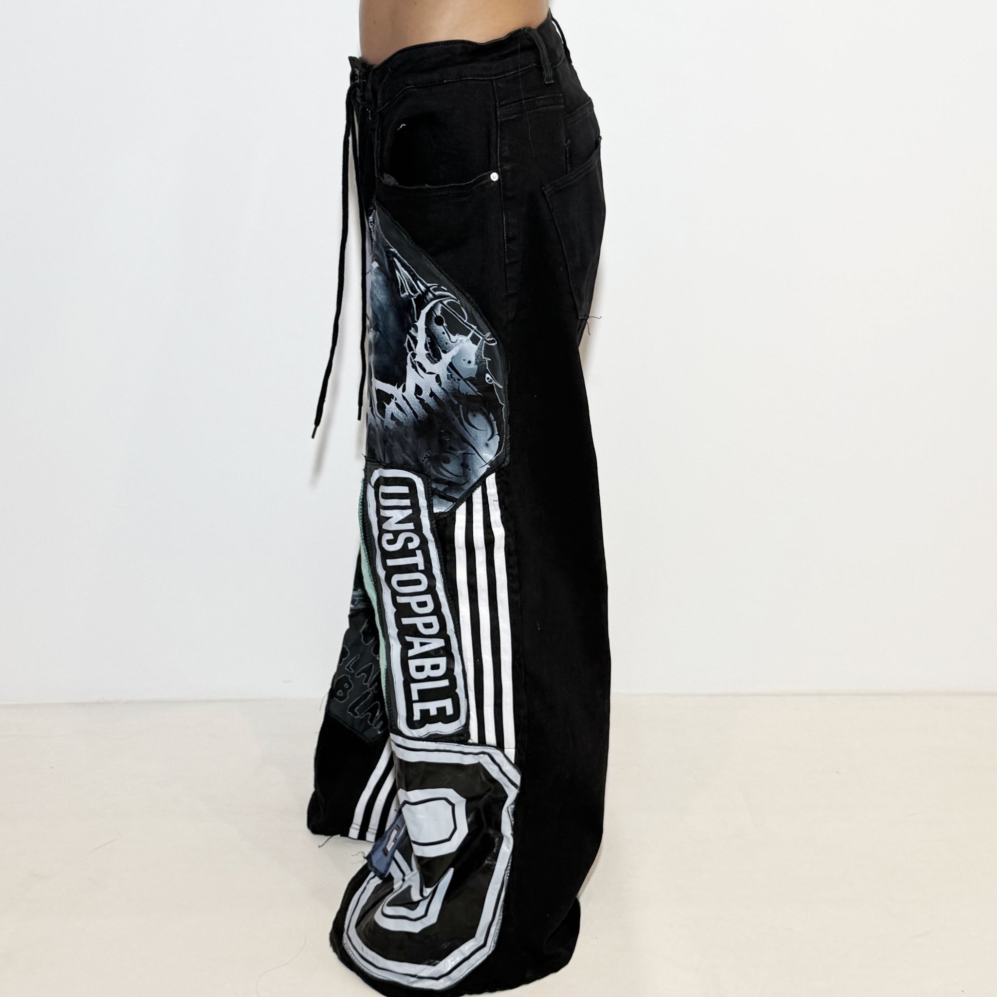 Reworked pants with patch. Adjustable with an elastic waistband.