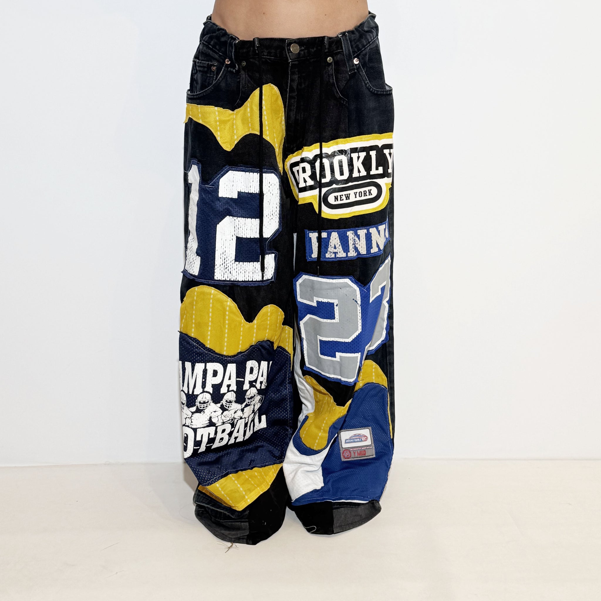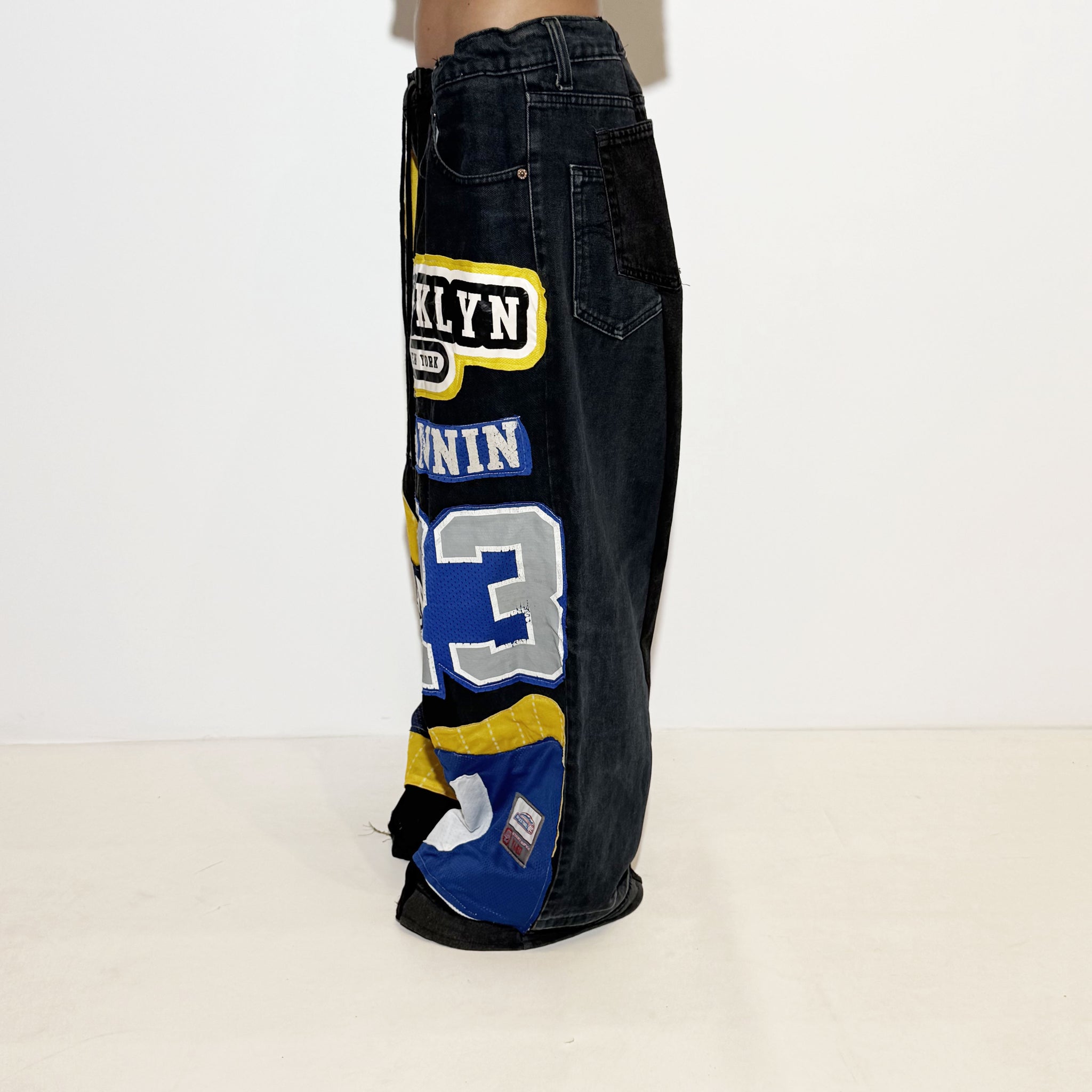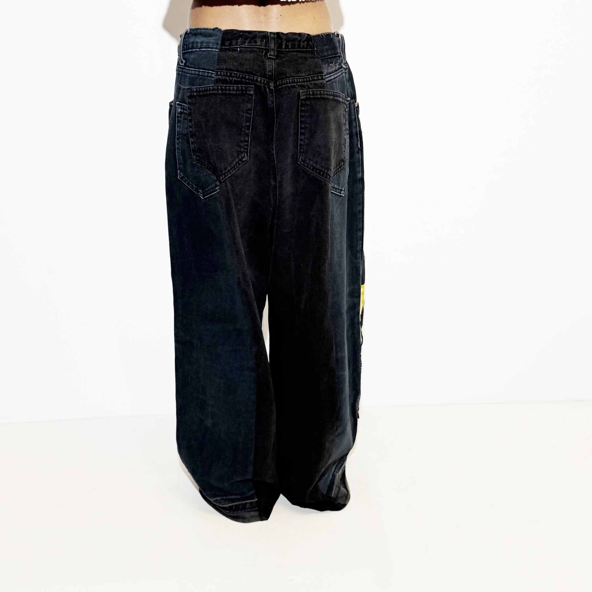 Reworked pants with patch. Adjustable with an elastic waistband.