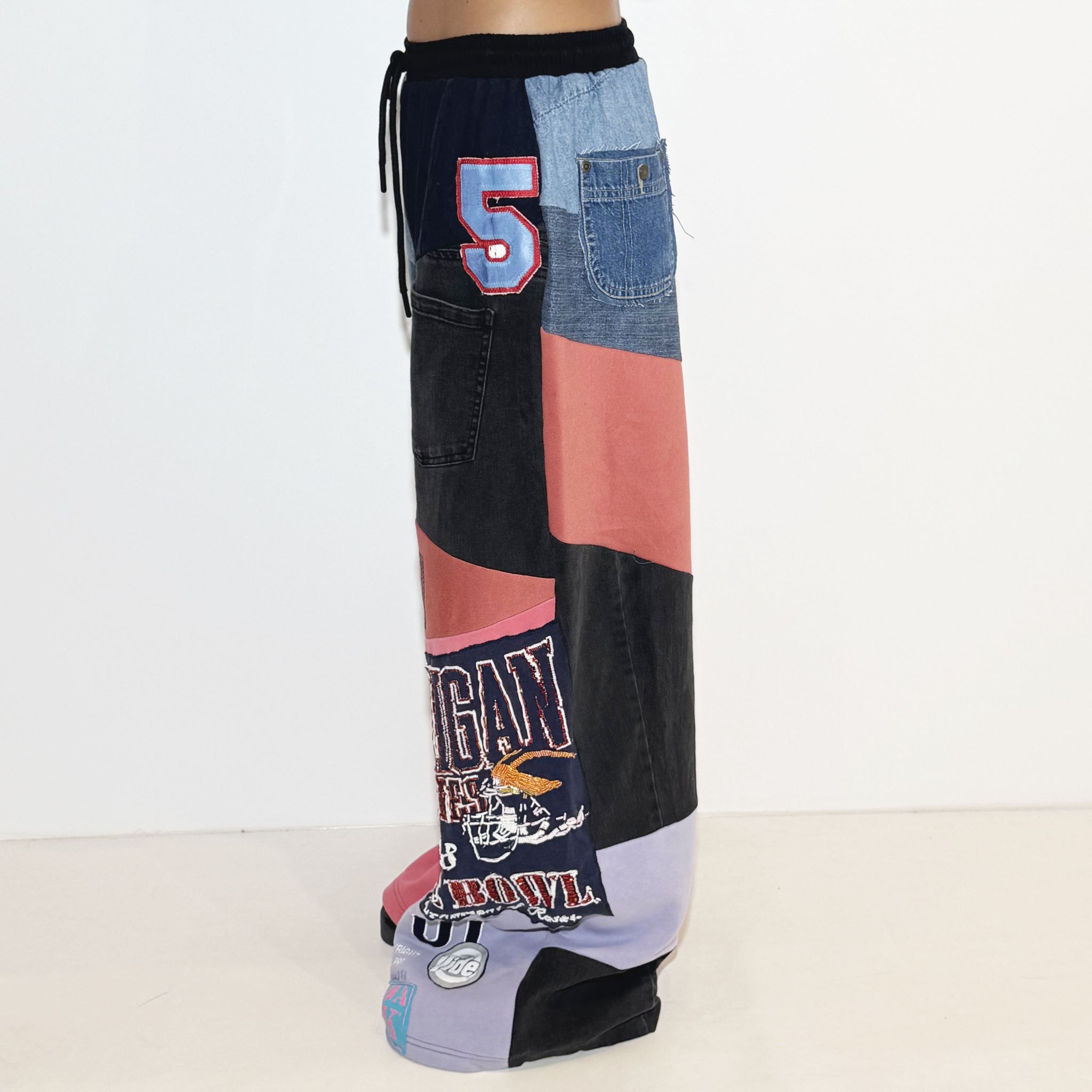 Reworked patchwork pants. Embroidery handmade. Adjustable with an elastic waistband.